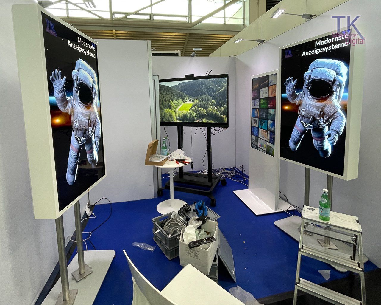 Unser Messestand mit gerade mal 9 m2 Fläche und 6 Displays und das beste Team: